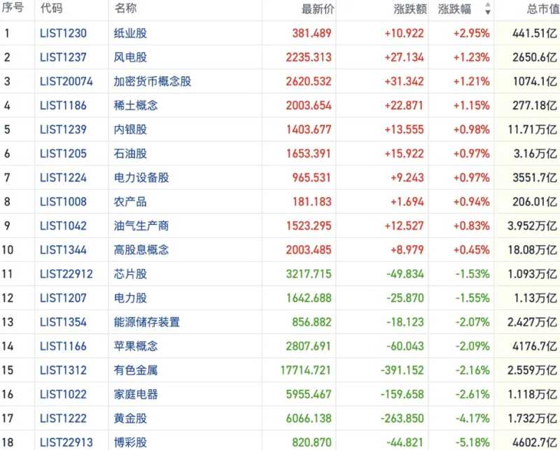 其他方向上,今日博彩股跌幅居前,黄金股全线下跌。此外,券商、影视、家电、半导体、保险等行业也多数表现低迷。