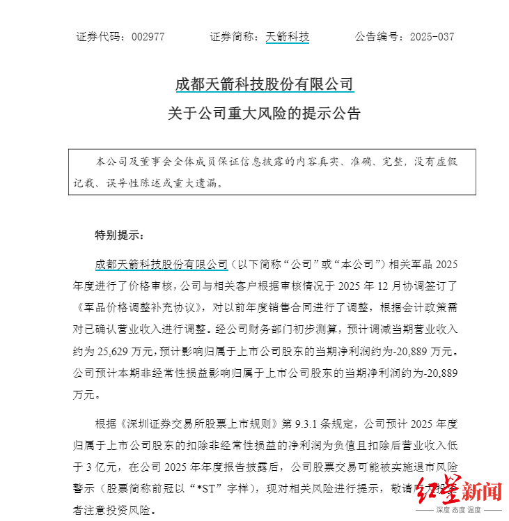 12月29日盘后,天箭科技(002977)发布重大风险提示公告。受军品价格调整影响,公司预计调减当期营业收入约2.56亿元,净利润将减少2.09亿元,2025年度扣非归母净利润为负且扣除后营业收入低于3亿元,年报披露后股票可能被实施退市风险警示(*ST)。