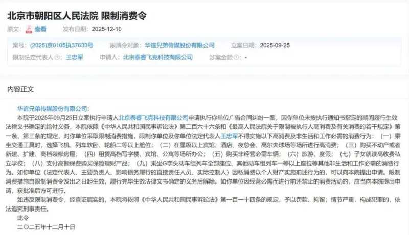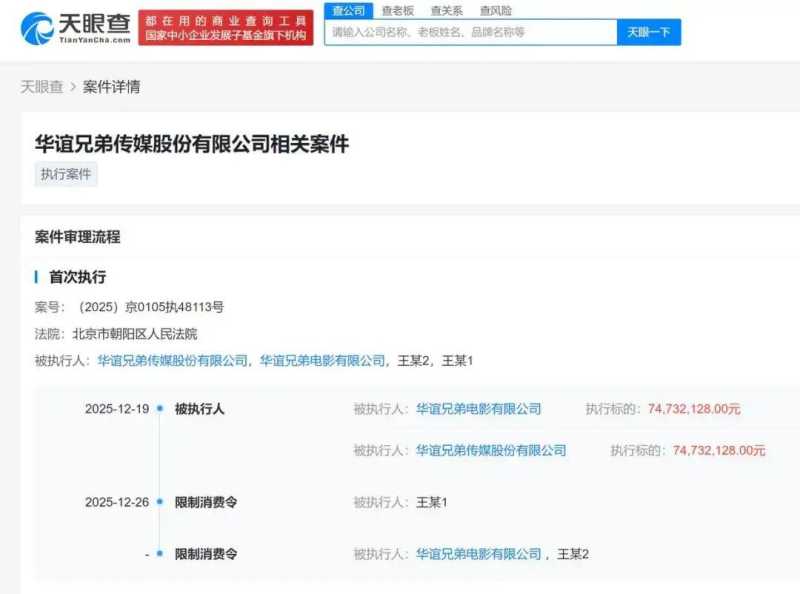 红星资本局12月29日消息,天眼查APP显示,近日,华谊兄弟电影有限公司、华谊兄弟传媒股份有限公司(300027.SZ)及两公司法定代表人王忠磊、王忠军被限制高消费,涉及7473万元执行案件,执行法院为北京市朝阳区人民法院。