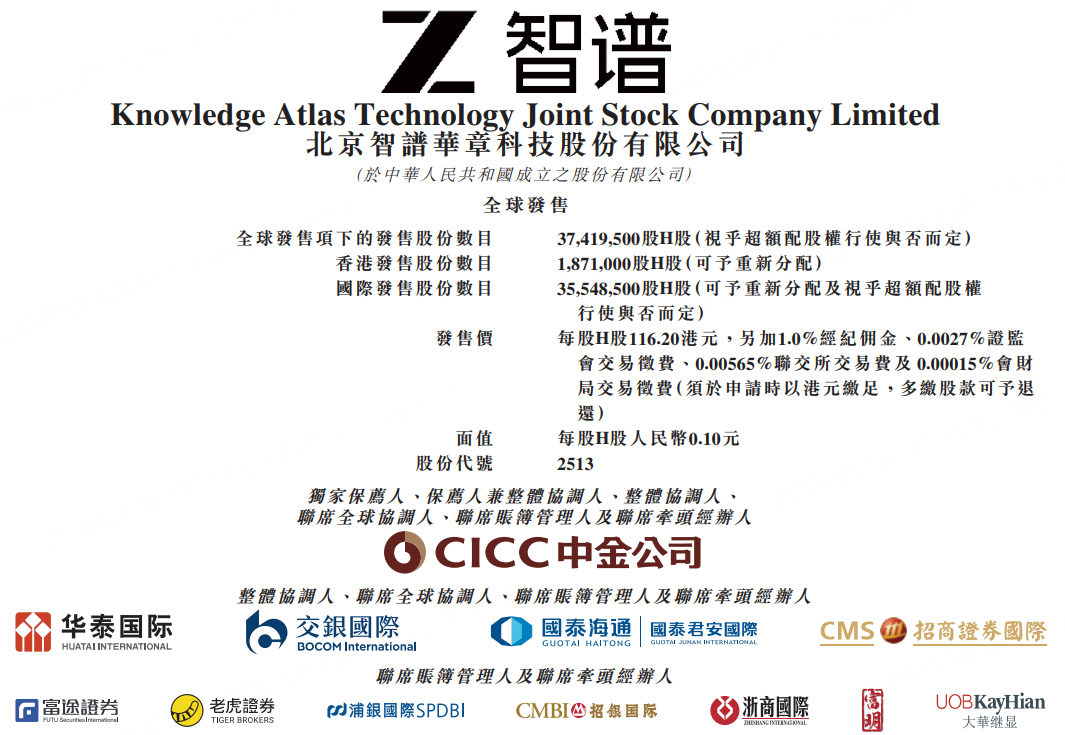 12月30日,智谱于12月30日至1月5日招股,公司拟全球发售3741.95万股H股,其中,香港发售占5%,国际发售占95%,另有超额配股权15%。每股发售价116.20港元,每手100股,预期将于2026年1月8日开始在联交所买卖。
