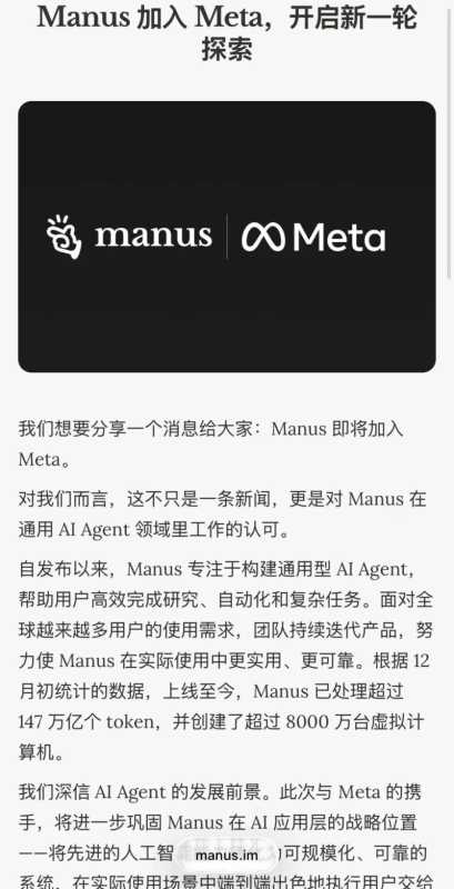Manus表示,被Meta收购,是对公司在AI Agent领域里工作的认可。自发布以来,公司专注于构建通用型AI Agent,帮助用户高效完成研究、自动化和复杂任务。面对全球越来越多用户的使用需求,团队持续迭代产品,努力使Manus在实际使用中更实用、更可靠。根据12月初统计的数据,上线至今,Manus已处理超过147万亿个token,并创建了超过8000万台虚拟计算机。
