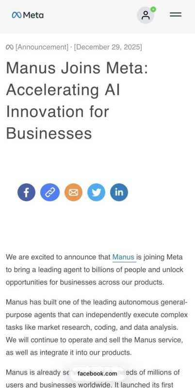 Meta在新闻稿中表示,“我们很高兴地宣布,Manus将加入Meta,为数十亿用户带来领先的Agent服务,并为使用我们的产品的企业创造更多机会。我们将继续运营和销售Manus服务,同时将其集成到我们的产品中。”