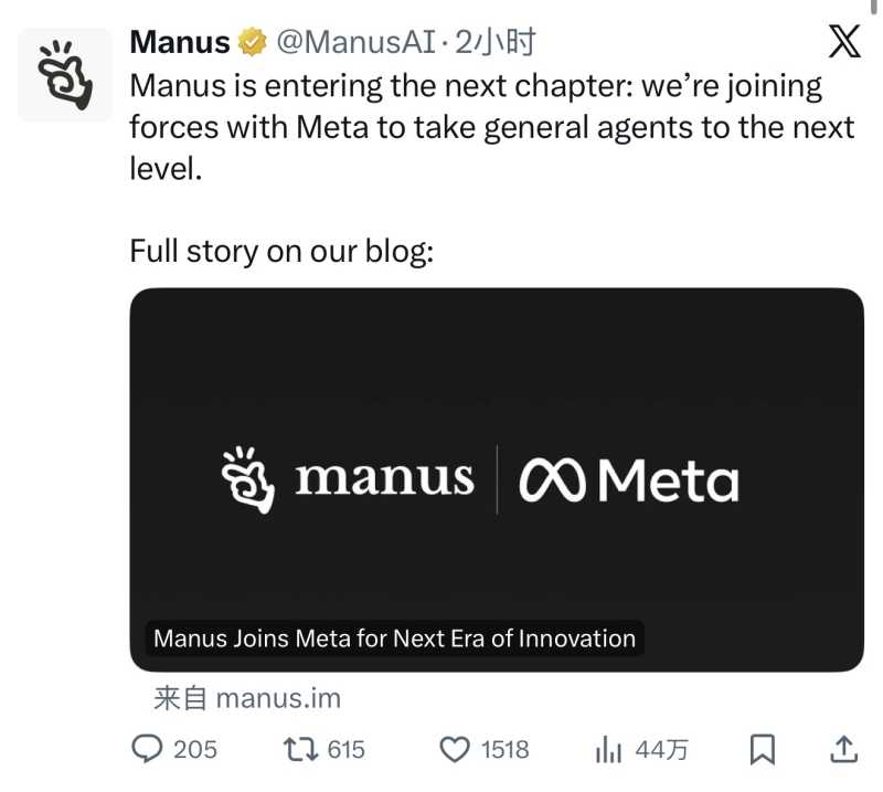 Manus创始人兼CEO肖弘表示:“与Meta的合作让我们能在更强大、可持续的基础上持续发展。我们期待在Meta平台上为更广泛的用户与企业提供服务。”