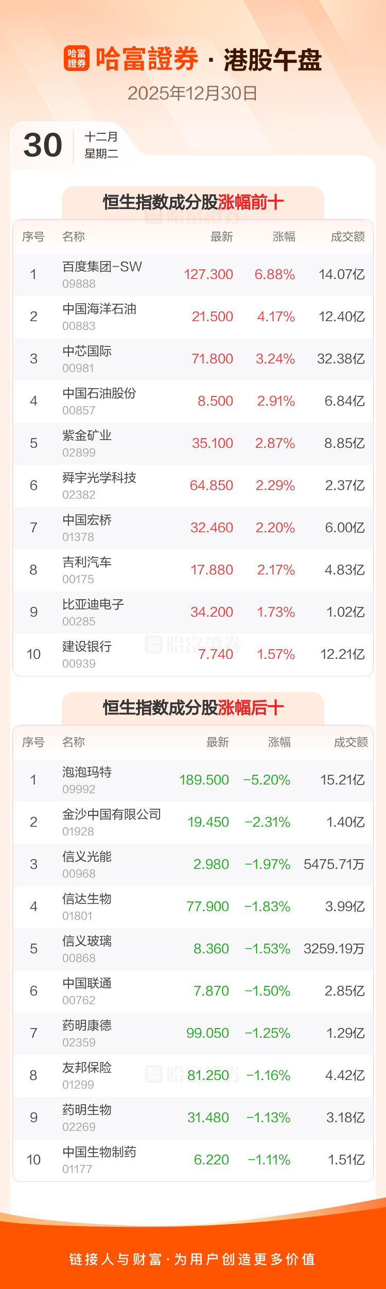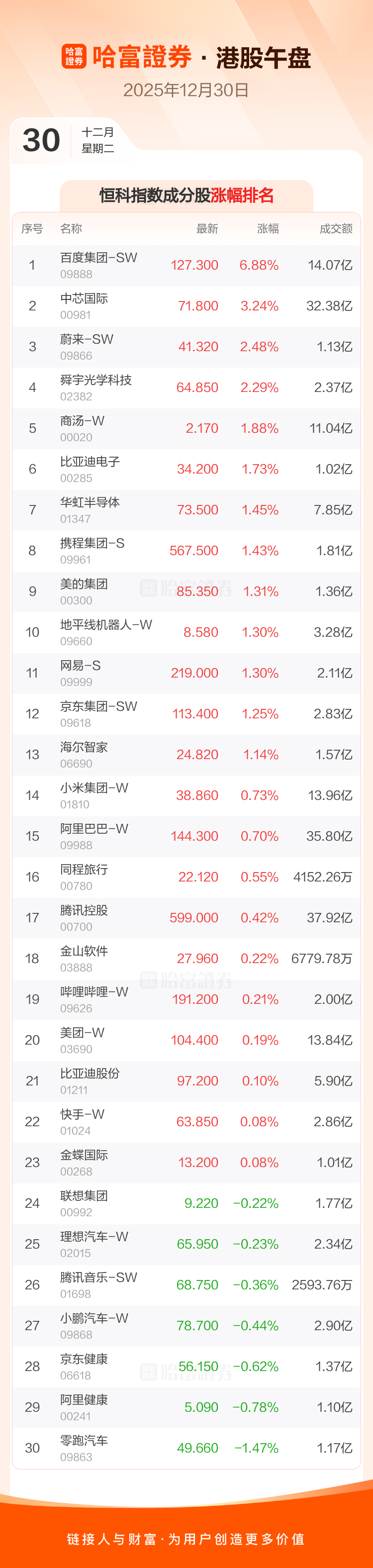 港股12月30日午盘走高,恒生指数收报25751.64点,涨116.41点,涨幅0.45%;恒生科技指数收报5540.44点,涨57.43点,涨幅1.05%。恒生指数成分股中百度集团-SW、中国海洋石油、中芯国际涨幅居前,泡泡玛特、金沙中国有限公司、信义光能跌幅靠前。恒生科技指数成分股中百度集团-SW、中芯国际、蔚来-SW涨幅居前,零跑汽车、阿里健康、京东健康跌幅靠前。