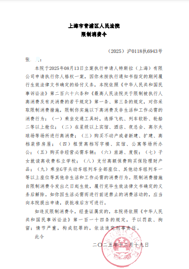 特斯拉“车顶维权”女车主张女士因未按执行通知书指定的期间履行生效法律文书确定的给付义务被上海市青浦区人民法院采取限制消费措施。