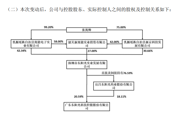 股权比例调整后,郭梅兰不再间接持有东阳光的股份;张寓帅将间接持有深圳市东阳光实业发展有限公司(下称“东阳光集团”)100%股权,从而间接持有东阳光38.70%股权。东阳光实控人将由张寓帅、郭梅兰变更为张寓帅。