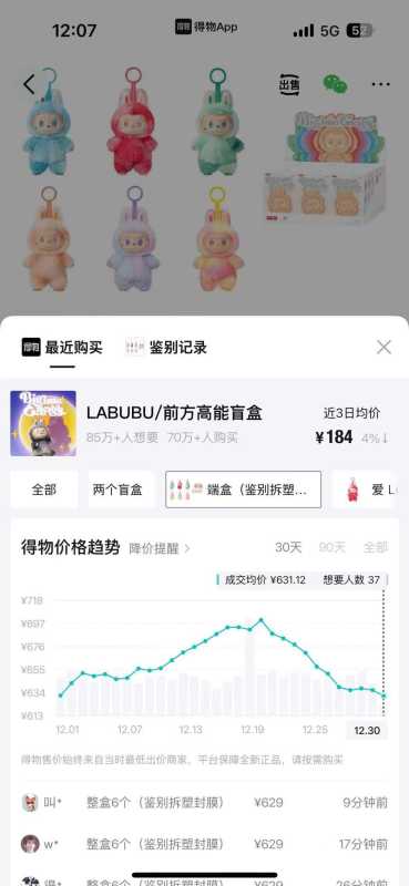 Labubu 3.0前方高能系列端盒款价格自12月19日起持续下跌。得物APP截图
