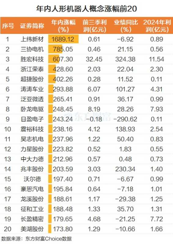 人形机器人概念2025年也表现强势,截至12月30日收盘,年内上涨77.85%。个股而言,上纬新材年内上涨1689.12%,暂居年内A股“涨幅王”的位置。年内上市新股三协电机紧随其后,年内涨幅785.05%。胜宏科技、浙江荣泰、超捷股份等也涨幅靠前。