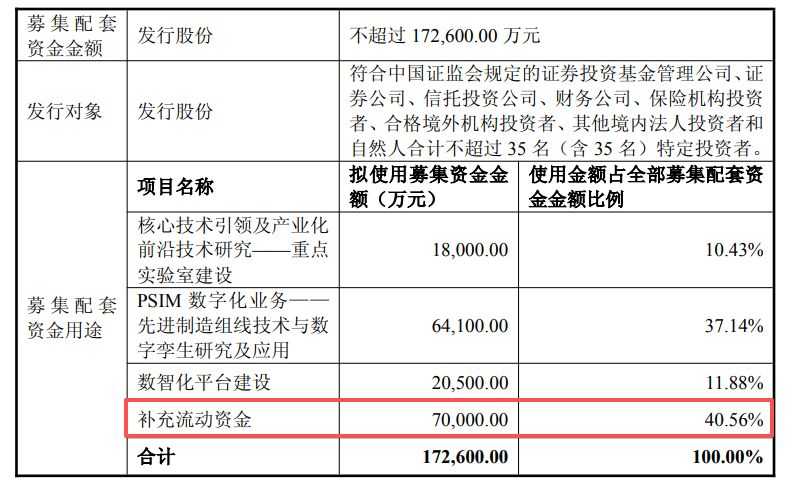 国投中鲁拟向不超过35名特定对象定增募资不超过17.26亿元,拟用于核心技术引领及产业化前沿技术研究——重点实验室建设、PSIM数字化业务——先进制造组线技术与数字孪生研究及应用、数智化平台建设和补充流动资金四个项目。需要指出的是,这四个募投项目中,补充流动资金(7亿元)的占比最大(约40.56%)。