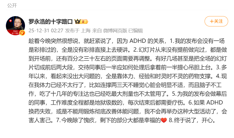 12月31日凌晨,罗永浩在微博发文回应“科技春晚”迟到40分钟:因为ADHD(注意缺陷与多动障碍)的关系,发布会没有一场是彩排过的,全是没有彩排直接上去硬讲。幻灯片从来没有提前做完过,都是做到开场前,还有百分之三十左右的页面需要再调整。“如果ADHD换药失败,或是不能用锻炼彻底改善体能问题,我不会再举办这种大型活动了,会害人害己。”