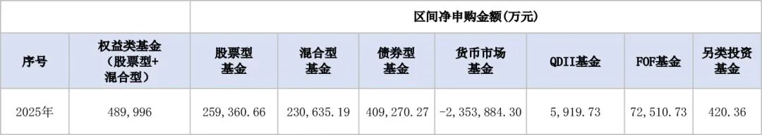 在各类基金中,权益类产品是公募机构2025年最青睐的自购品种。紧随其后的是债券型基金,公募机构净申购逾40亿元,与权益类基金相差逾8亿元。同时,货币基金被大幅净赎回超235亿元,许多自购资金转向了权益类资产。