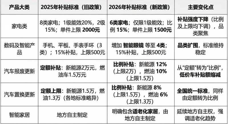 12月30日盘后,发改委、财政部公布2026年“国补”政策:AR眼镜等智能产品最新纳入补贴范围;智能家居明确包含“适老化家居”;延续支持汽车报废更新、汽车置换更新,补贴方式由“定额”改为“按比例”,新能源车报废更新补贴车价的12%(上限2万),燃油车报废更新补贴车价的8%(上限1.5万),新能源车置换更新补贴车价的8%(上限1.5万),燃油车置换更新补贴车价的6%(上限1.3万)。