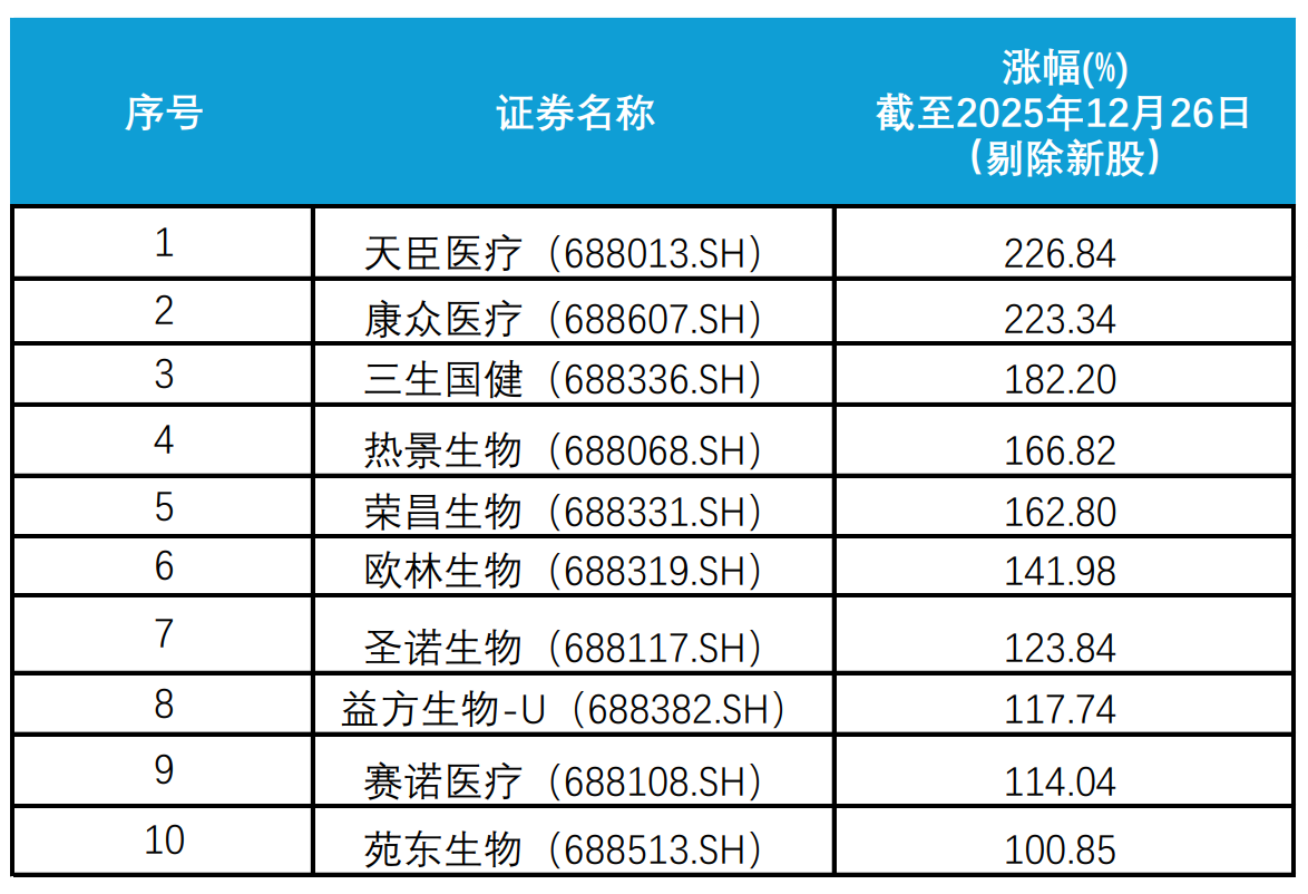 具体到医药板块个股的表现上,截至2025年12月26日,科创板医药板块有40家企业年内股价的涨幅超50%。