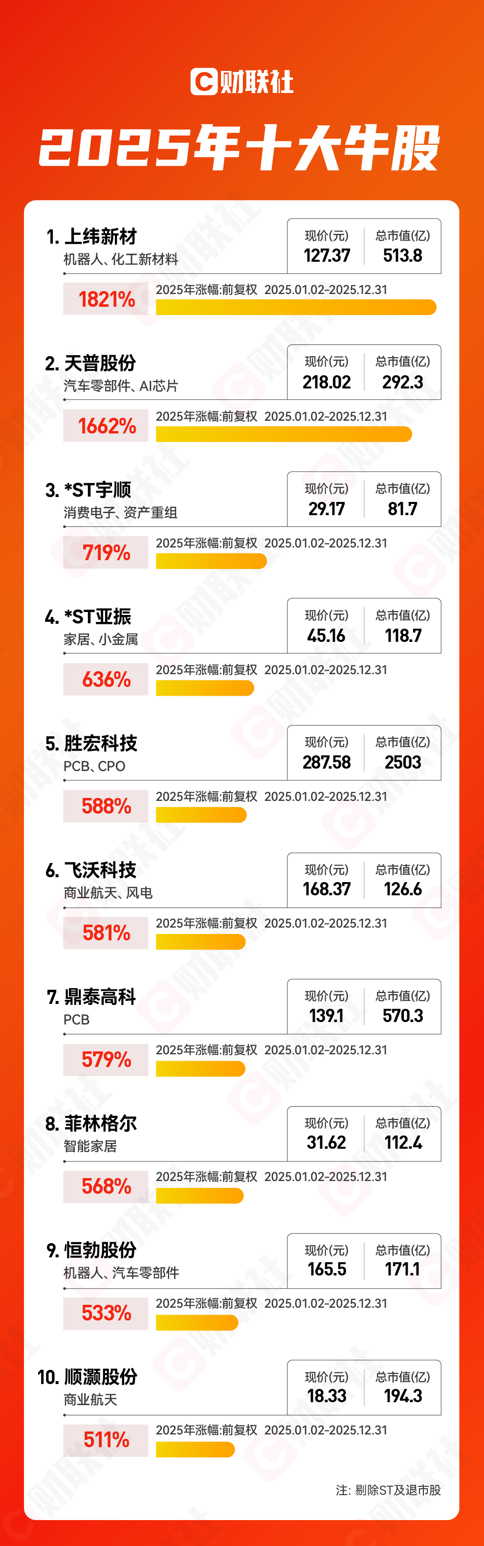 从个股角度来看,2025年的十大牛股涨幅均超过500%。其中,上纬新材以1821%涨幅夺魁,天普股份以1662%涨幅位居第二,*ST宇顺(719%)、*ST亚振(636%)紧随其后,胜宏科技(588%)排在第五。