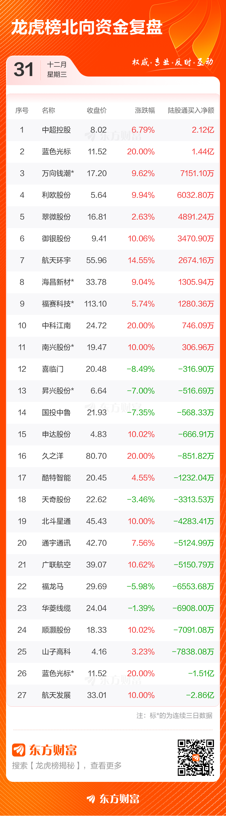 紫金矿业、寒武纪、工业富联位列沪股通成交前三,成交额分别为30.45亿、16.25亿、14.68亿;新易盛、中际旭创、航天发展位列深股通成交前三,成交额分别为23.06亿、20.06亿、19.55亿。