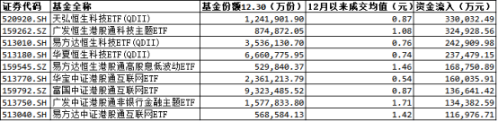 科技板块成为吸金主力。以天弘恒生科技主投港股科技资产。Choice数据显示,12月以来至12月30日,易方达恒生科技ETF(QDII)、华夏恒生科技ETF(QDII)、华宝中证港股通互联网ETF等多只ETF均获得超10亿元资金买入。