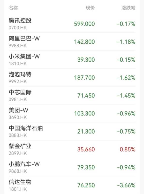 盘面上,大型科技股多数走低,京东集团、阿里巴巴跌超1%;互联网医疗股走低,京东健康、平安好医生、阿里健康跌超1%;汽车股走弱,零跑汽车跌近3%,比亚迪股份跌超2%;保险股、半导体股、生物技术股等多数下跌。