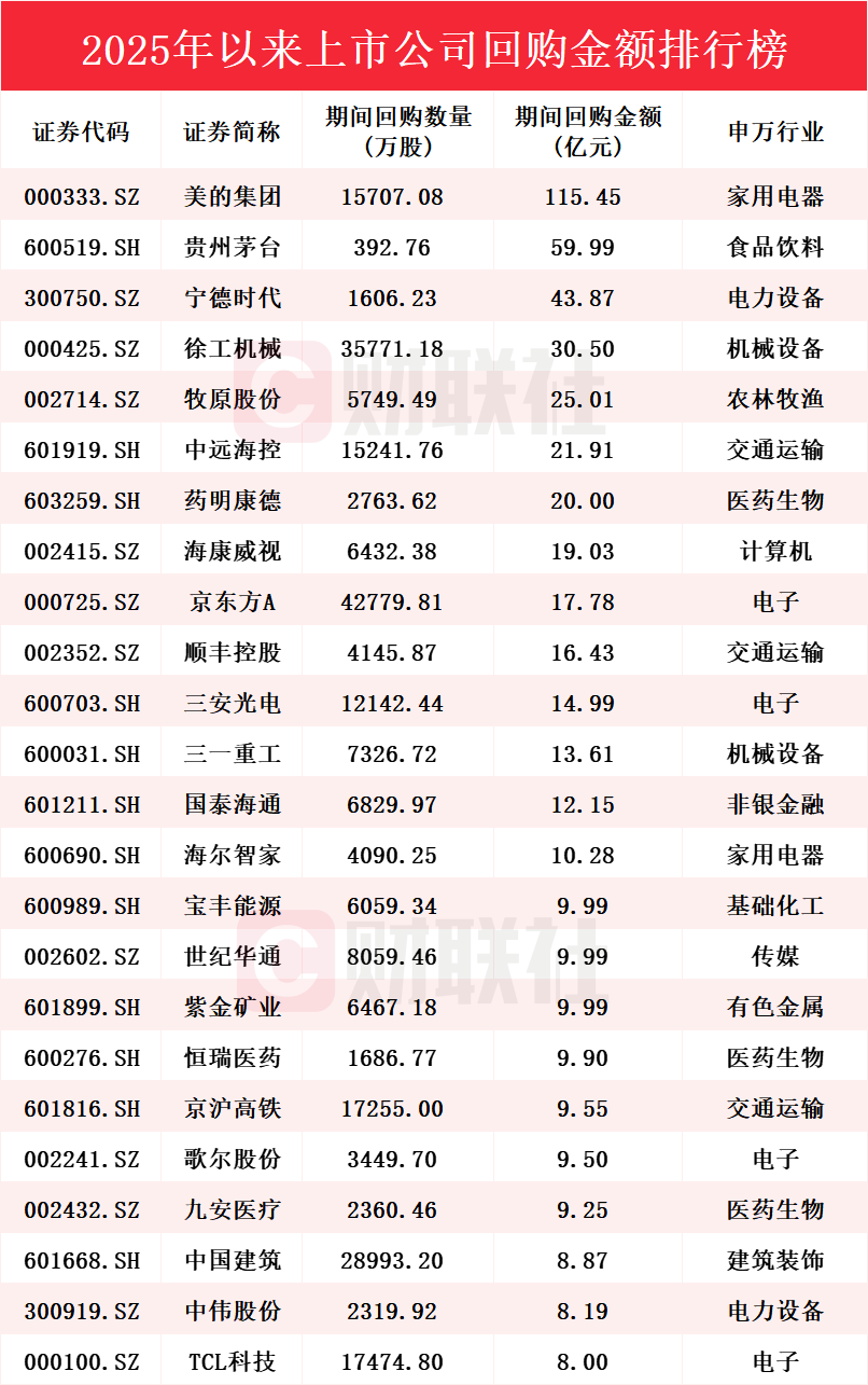Choice数据显示,截至发稿,2025年以来,已有1494家上市公司实施股份回购,累计回购金额为1392.84亿元。从上市公司回购的金额来看,有14家公司回购金额超过10亿元。其中,美的集团回购额位居榜首,金额达115.45亿元;贵州茅台回购额为59.99亿元位列第二;宁德时代回购额为43.87亿元位列第三。此外,徐工机械回购额为30.5亿元,牧原股份、中远海控、药明康德回购额均超20亿元,海康威视、京东方A、顺丰控股、三安光电、三一重工、国泰海通和海尔智家回购额皆超10亿元。