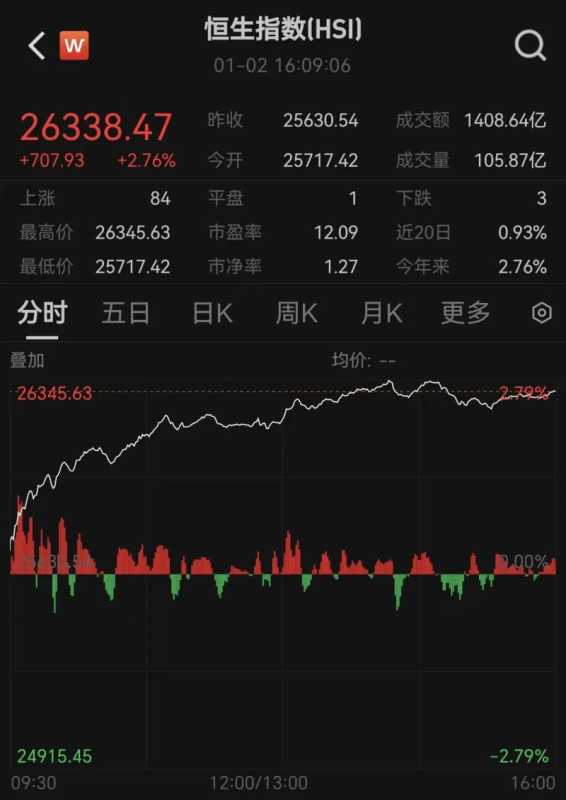 1月2日,港股开年大涨,恒生指数收涨2.76%,恒生科技指数涨4%。