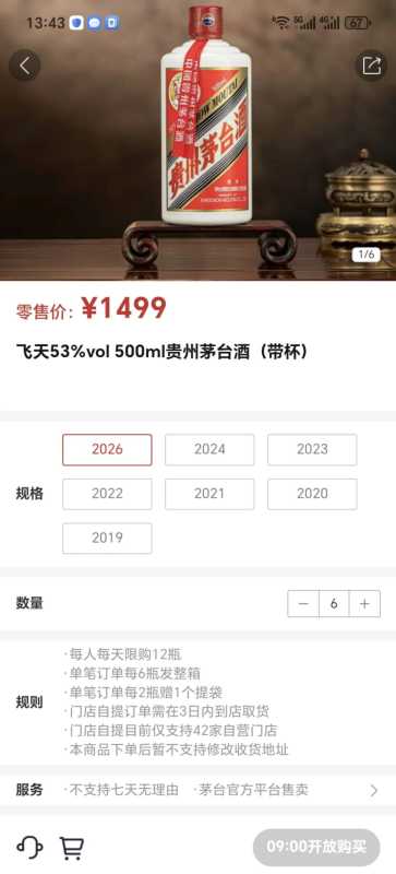 此前,2025年12月31日晚间,贵州茅台“小茅i茅台”发布消息称,2026年1月1日起,飞天53%vol 500ml贵州茅台酒将于i茅台上架开售,每人每天可以购买12瓶。
