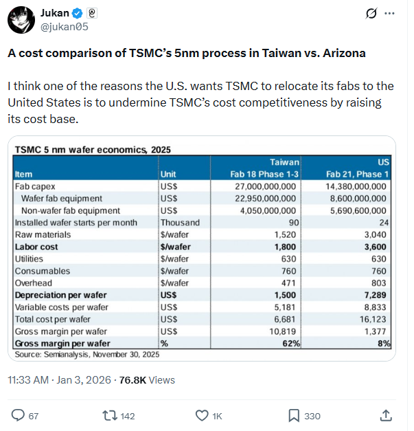 据分析师Jukan在X平台上分享的SemiAnalysis汇总数据显示,台积电在美国生产芯片将使其利润率遭受重大损失。他还写道,他认为美国希望台积电将晶圆厂迁至美国的原因之一,就是为了提高该公司的成本来削弱台积电的竞争力。