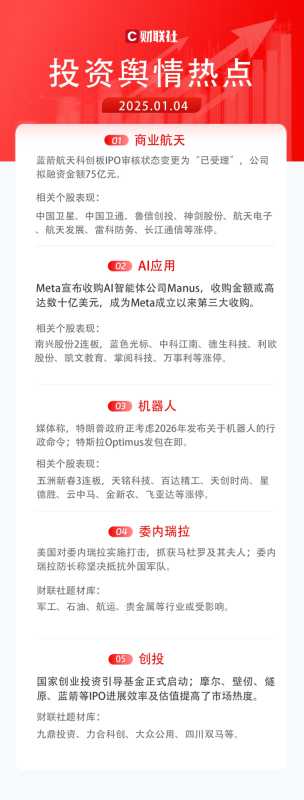 本文介绍了商业航天、AI应用、机器人及创投等领域的最新动态,包括蓝箭航天科创板IPO进展、Meta收购AI智能体公司Manus等。