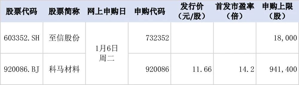 据目前安排,若无变化,下周(1月5日至9日)有2只新股可申购,包括沪市主板1只和北交所1只。