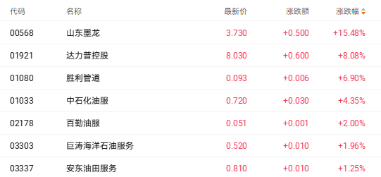 受地缘政治事件影响,港股油气设备板块今日走强。截至发稿,山东墨龙(00568.HK)涨15.48%、达力普控股(01921.HK)涨2.90%、中石化油服(01033.HK)涨4.35%、百勤油服(02178.HK)涨2%。