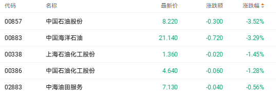 而上游石油巨头普遍走弱,截至发稿,中国石油股份(00857.HK)跌3.52%、中国海洋石油(00883.HK)跌3.29%、中国石油化工股份(00386.HK)跌1.28%。