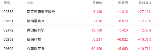 今日港股脑机接口概念股集体走强。截至发稿,南京熊猫电子股份(00553.HK)涨27.12%、微创脑科学(02172.HK)涨12.57%、脑洞科技(02203.HK)涨10.73%。