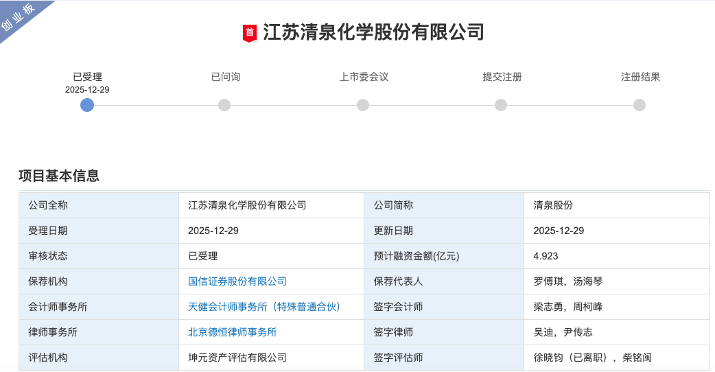 深交所官网显示,江苏清泉化学股份有限公司(以下简称“清泉股份”)于12月29日更新上市申请审核动态,该公司创业板IPO申请已获深交所受理。