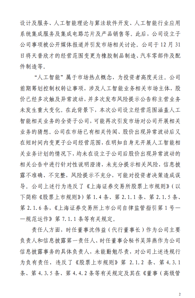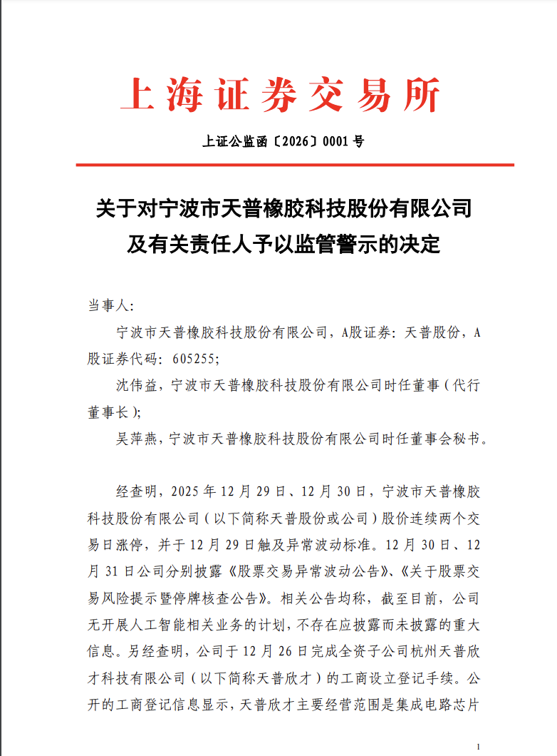 1月5日,上交所对宁波市天普橡胶科技股份有限公司及有关责任人予以监管警示。上交所表示,“人工智能”属于市场热点概念,为投资者高度关注。公司前期筹划控制权转让事项,涉及人工智能业务相关市场主体,股价已经多次触及异常波动,并多次发布风险提示公告称主营业务未发生重大变化。在此背景下,本次公司设立经营范围涵盖人工智能相关业务的全资子公司,可能再次引发市场对公司开展相关业务的猜想。公司在市场已有相关传闻、股价出现异常波动后又在短时间内变更子公司经营范围,在明知自身无开展人工智能相关业务计划的情况下,均未在设立子公司后股价出现异常波动的相关公告中进行针对性说明澄清,未充分提示相关风险,信息披露不准确、不完整,风险提示不充分,可能对投资者决策造成误导。公司上述行为违反了《上海证券交易所股票上市规则》(以下简称《股票上市规则》)第1.4条、第2.1.1条、第2.1.5条、第2.1.6条,《上海证券交易所上市公司自律监管指引第1号——规范运作》第7.1.1条等有关规定。