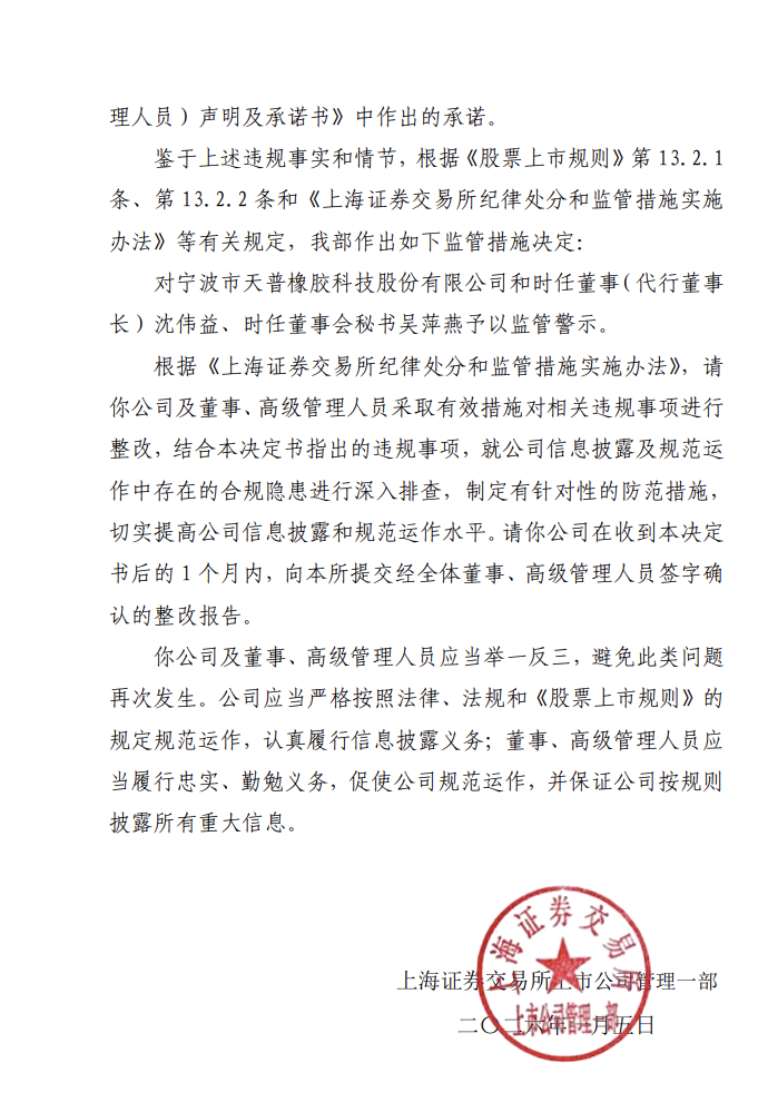 上交所对天普橡胶发布监管警示