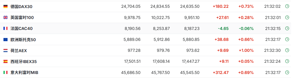 正在交易的欧洲股市多数走高,德国DAX指数现涨0.73%,英国富时100指数涨0.28%,法国CAC40指数跌0.06%。