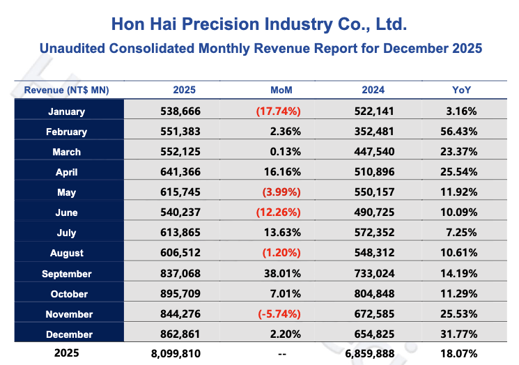 数据显示,鸿海精密去年12月实现营收8629亿新台币(约合人民币1915亿元),同比增加31.77%,创历年同期新高;四季度营收2.6万亿新台币(约合人民币5776亿元),同比增长22.07%,同样为历年同期新高;2025全年营收为8.099万亿新台币(约合人民币1.79万亿元),同比增加18.07%,也是历史新高。