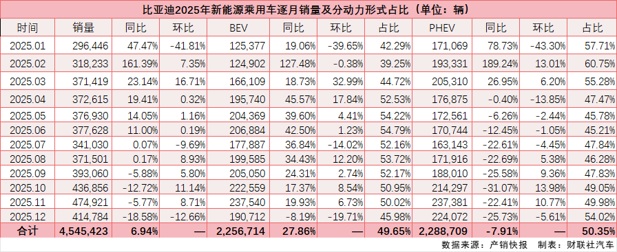 此次密集推新背后,是比亚迪对插混市场局势的判断和调整。产销快报显示,比亚迪2025年以460.24万辆的全年销量稳居行业榜首,其中纯电动车型销量达225.67万辆,同比增长27.86%,首次超越特斯拉登顶全球纯电销冠。但与之形成反差的是,插电式混合动力车型累计销量为228.87万辆,同比下降7.91%,插混板块成为拖累其整体增长的短板。