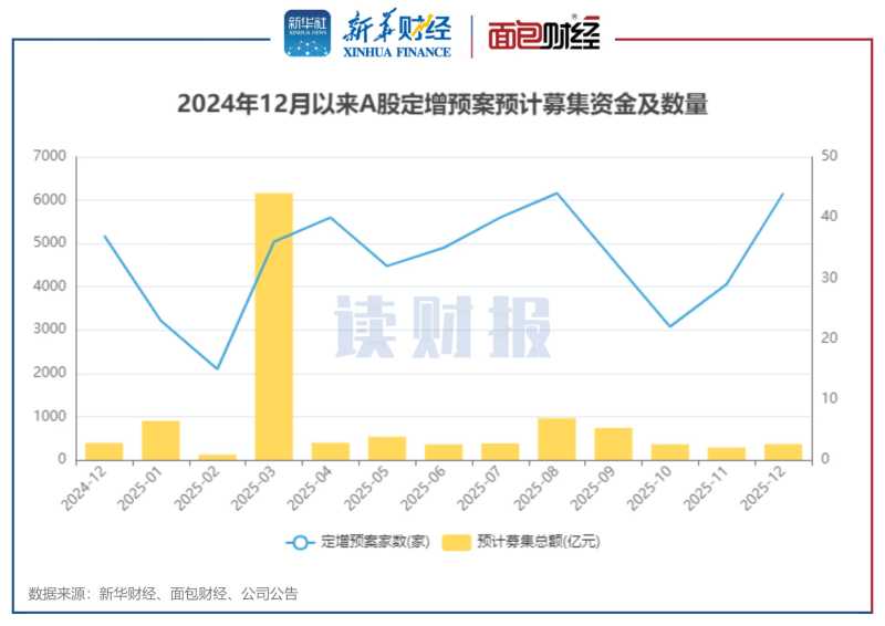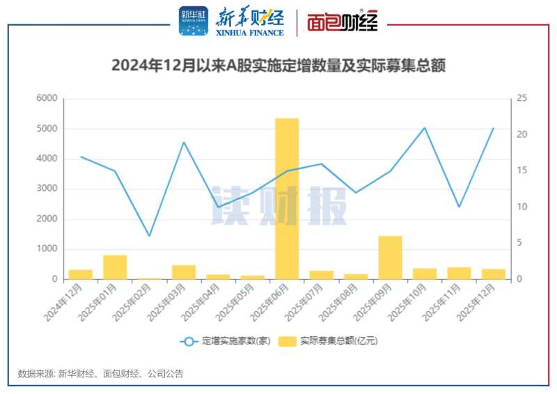 新华财经北京1月6日电统计显示,2025年12月,A股上市公司共计实施定增22起,同比上升24%;实际募资总额约349亿元,同比上升7%。