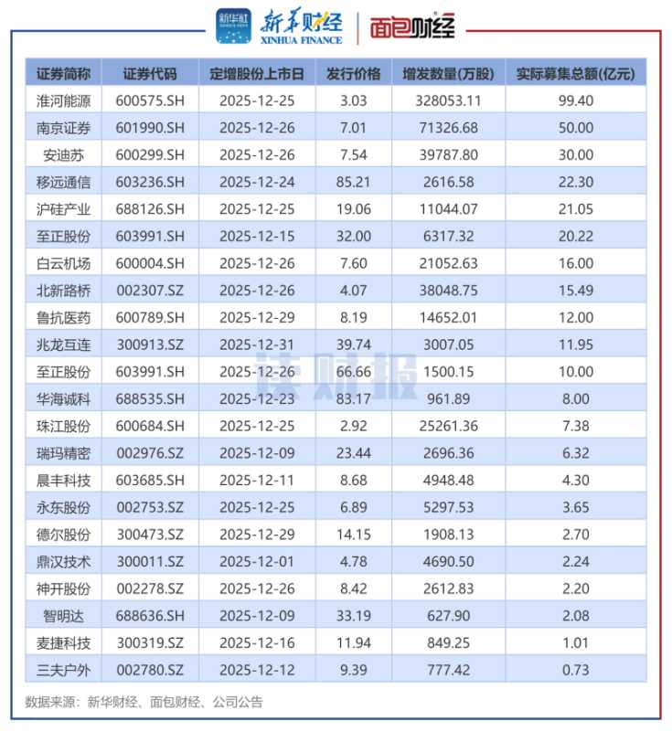 2025年12月实施定增的上市公司中,淮河能源的实际募资额排在首位。淮河能源新增股份数量为328053.11万股,发行价格为3.03元/股,实际募资总额为99.4亿元,募集资金净额拟用于购买淮南矿业持有的电力集团89.30%股权。
