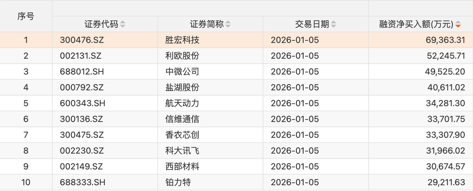 个股方面,63只个股获融资净买入额超1亿元。胜宏科技获融资净买入额居首,净买入6.94亿元;融资净买入额居前的还有利欧股份、中微公司、盐湖股份、航天动力、信维通信、香农芯创、科大讯飞、西部材料、铂力特等。