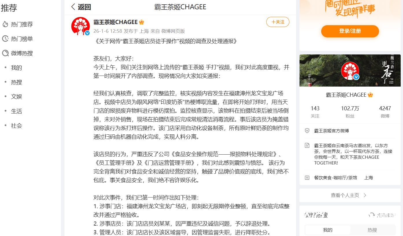 针对此事,1月6日,霸王茶姬相关负责人向南都湾财社记者发来品牌声明,该声明亦发布于品牌方官方微博上。