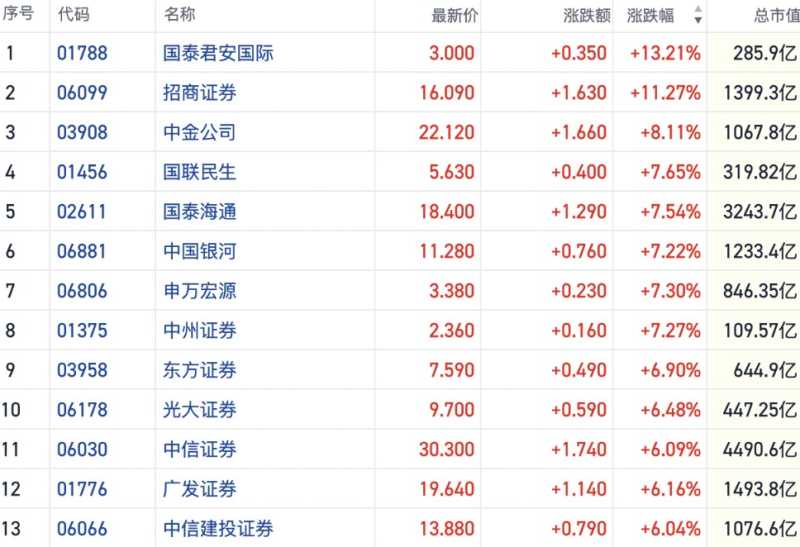 截至发稿,国泰君安国际(01788.HK)涨近13%,中金公司(03908.HK)、国泰海通(02611.HK)、招商证券(06099.HK)等多家券商也跟涨6%以上。