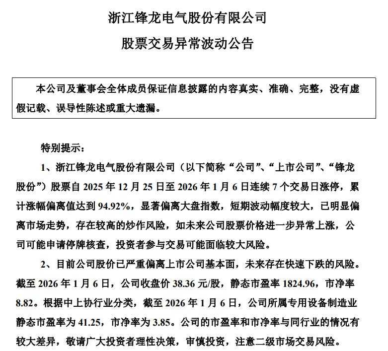 锋龙股份(002931.SZ)公告称,公司股票自2025年12月25日至2026年1月6日连续7个交易日涨停,累计涨幅偏离值达到94.92%,显著偏离大盘指数,短期波动幅度较大,已明显偏离市场走势,存在较高的炒作风险,如未来公司股票价格进一步异常上涨,公司可能申请停牌核查,投资者参与交易可能面临较大风险。
