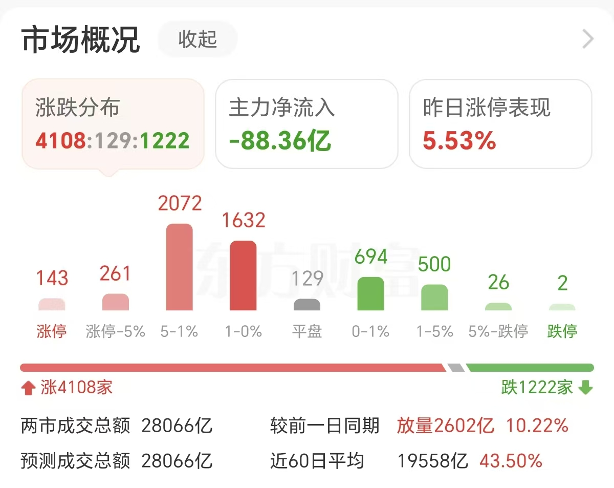 盘面上,市场热点轮番活跃,全市场超4100只个股上涨,其中有143只个股涨停,连续两日超百股涨停。
