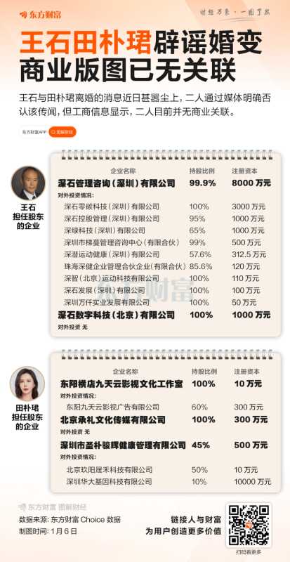 此次虽然双方火速辟谣了婚变传闻,但相关工商信息显示,田朴珺与王石目前无直接商业关联。