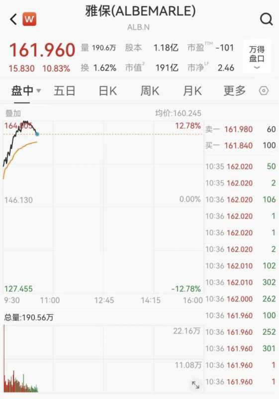 美股锂电池概念走高,截至发稿,美国雅保涨近11%,智利矿业化工涨近7%。