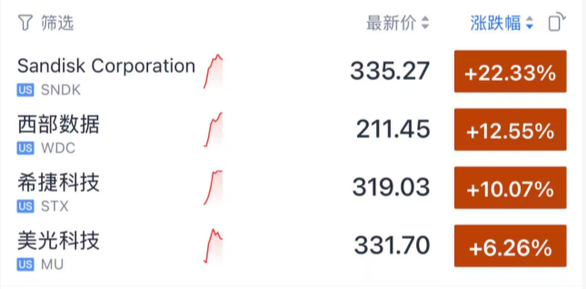 此外,今晚美股最大的亮点,是存储芯片概念股集体大涨,其中,SanDisk大涨超20%,美光科技涨超6%,西部数据涨超12%,希捷科技涨超10%。