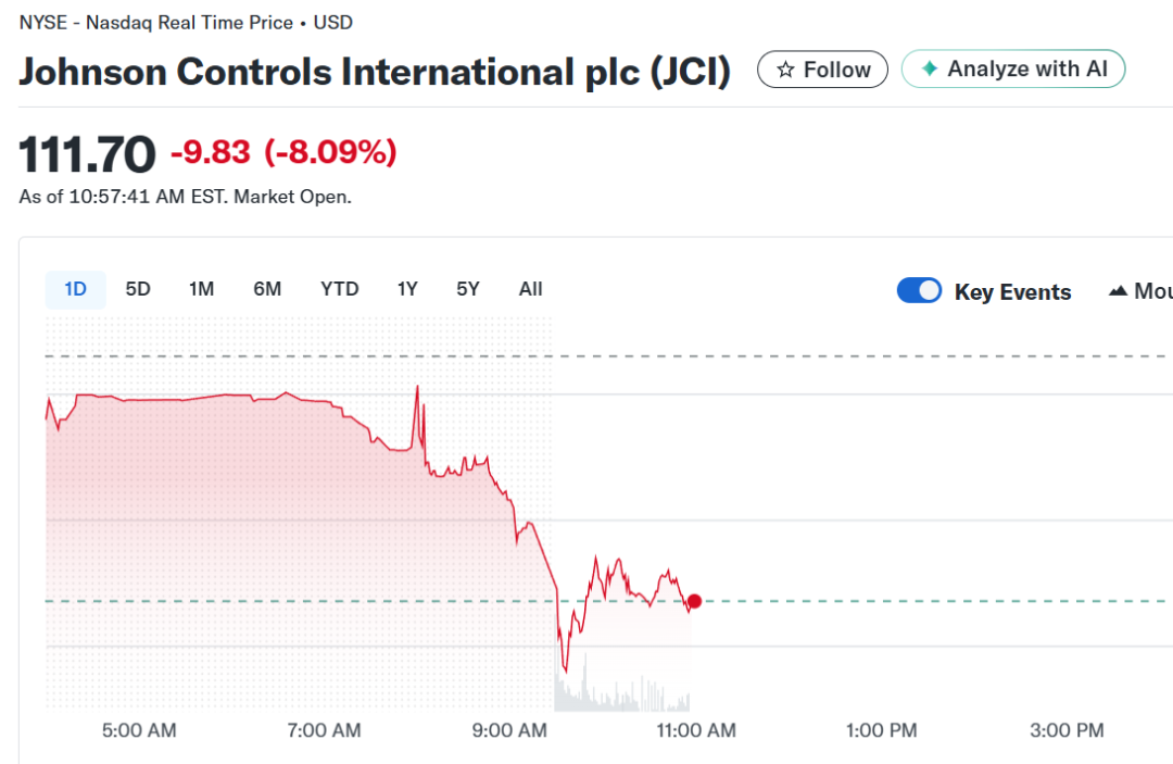 生产水冷机组及类似设备的Johnson Controls股价一度暴跌最多11%,创下自2022年以来最大盘中跌幅。莫迪恩制造暴跌超10%,而开利全球和特灵科技也同步走低。