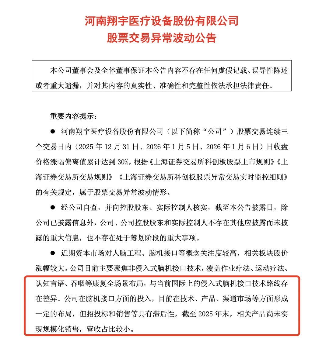 翔宇医疗已连续两日现20%涨停,累计涨幅达44%。1月6日晚间,翔宇医疗发布股票交易异常波动公告称,关注到近期资本市场对人脑工程、脑机接口等概念关注度较高,相关板块股价涨幅较大。公司目前主要聚焦非侵入式脑机接口技术,覆盖作业疗法、运动疗法、认知言语、吞咽等康复全场景布局,与当前国际上的侵入式脑机接口技术路线存在差异。