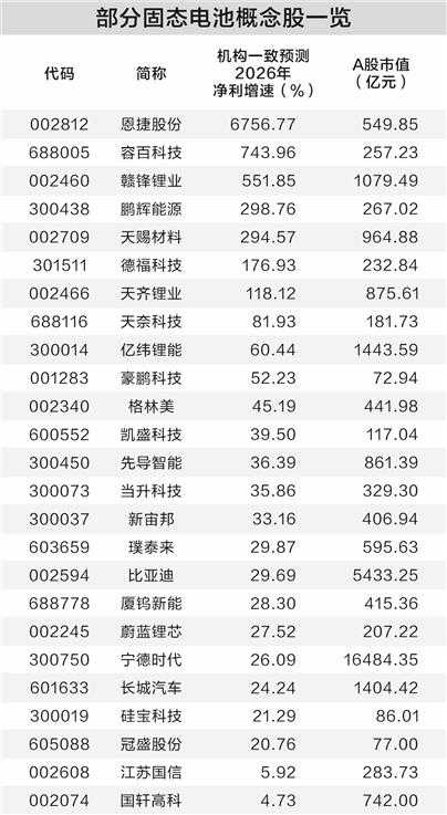 部分个股2026年业绩有望大幅增长。根据机构一致预测,3家以上机构评级的固态电池概念股中,恩捷股份、容百科技、赣锋锂业等个股今年净利有望翻倍增长,天奈科技、亿纬锂能、豪鹏科技等个股净利增速均超50%。