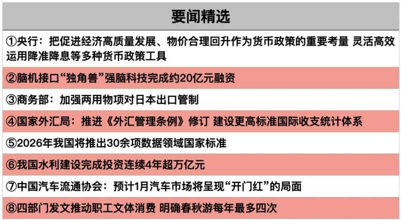 ①2026年中国人民银行工作会议1月5日—6日召开。会议强调,继续实施适度宽松的货币政策,发挥增量政策和存量政策集成效应,加大逆周期和跨周期调节力度,提升金融服务实体经济高质量发展质效,深化金融改革和更高水平对外开放,增强宏观政策前瞻性针对性协同性,着力扩大内需、优化供给,防范化解风险、稳定社会预期,为经济稳定增长、高质量发展和金融市场稳定运行营造良好的货币金融环境,为实现“十五五”良好开局提供有力的金融支撑。